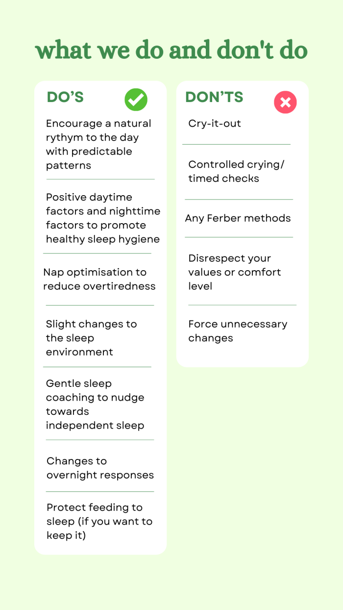 We use attachment-based sleep strategies to solve sleep challenges allowing both baby and parent to have a better nights sleep. This is the softer side of sleep training, also known as sleep coaching. We take a developmental approach that focuses on normal infant sleep while nudging towards more independence when baby is developmentally able to do so.